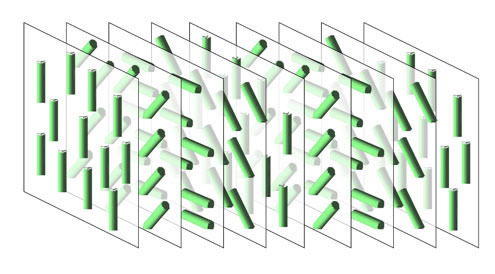 光回折実験の結果、ブルー相は光の波長(数百nm)程度の格子定数の巨大な立方晶を形成していることが実証された。そうなると一つの単位格子の中に107個もの分子が入っていることになる。ブルー相研究が直面した最大の問題は、これほどの多数の分子が格子中でどのような配列構造を形成しているか、であった。その配列の基本形態は「ねじれ(twist)」である。ここで、そのねじれが織りなす分子配列構造について紹介する。