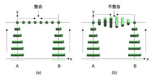 任意の距離離れたA, Bからの配列操作で不整合は生じない。(b)二重ねじれの場合、不整合が生じる。