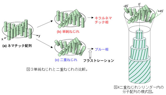 キラルネマチック相は図1のように分子配列にらせん構造を有している。このような構造は自然界に多く見られ、代表的な分子組織構造のひとつである。らせん構造を形成する液晶相は一般にキラル分子から構成されている(あるいはキラル分子を含んでいる)。キラル分子同士の分子間相互作用により、棒状の液晶分子がその長軸を互いに平行に配列させるより少しねじれた状態の方が安定となり、そのねじれる向きが全ての分子間で同じであることがらせん構造の形成の原因と理解されている。この場合、分子配列のねじれは、分子ラテラル方向(長軸に垂直方向)の一つの軸に沿って形成される、いわゆる単純ねじれ(simple twist)である。ところが、分子1個に着目すると、分子は長軸周りに高速で回転しており、分子間相互作用は全ラテラル方向に等方的に作用するはずである。したがって、ラテラル方向に隣接する全ての分子に対してねじれ配列を誘起するはずである。単純ねじれでは、ねじれを誘起しない方向ができてしまう。