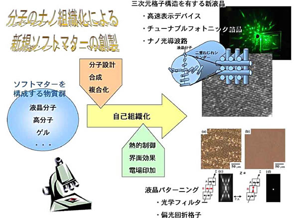 液晶, (高分子/液晶) 複合系, ブルー相, フラストレイト相, ソフトマテリアル, 界面相互作用, アンカリング効果, 電気光学効果, ディスプレイ, 光スイッチング, カー効果, フォトニック結晶, 和周波発生, 一本鎖, 分子ばね