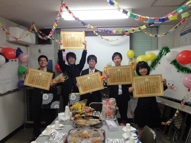 研究室内で学位授与式が行われ、M2とB4の総勢5名が卒業されました。今までお疲れさまでした。