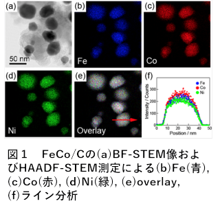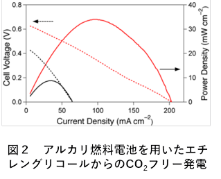 我々がPt触媒上でのエチレングリコールの酸化反応の生成物を調べたところ、非常に高い選択率でエチレングリコールをその4電子酸化生成物であるグリコール酸まで酸化することがわかった。エチレングリコールを8電子酸化反応の生成物であるシュウ酸まで酸化するには、触媒表面との相互作用を増大させることが重要であると考えられる。我々は、エチレングリコールの水酸化基(OH基)を触媒に接近させるために、酸素との親和性の高いFe族金属に着目し、種々のカーボンに担持されたFe族ナノ金属触媒(Fe/C, Co/C, Ni/C, FeCo/C, FeNi/C, CoNi/C)の開発を行い、液相化学還元と水素還元を組み合わせた2ステップ方とよぶ新規のナノ合金作成法を開発した(図1)。さらに、作成されたFeCo/C触媒をアルカリ燃料電池のアノードとしt用いることで、エチレングリコールからの発電にも成功した(図2)。ここで、エチレングリコールのC2化合物への選択率は99%であることがわかった。これは、CO2の発生なしにエチレングリコールから発電した初めての例である(Sci. Rep., 2013)。