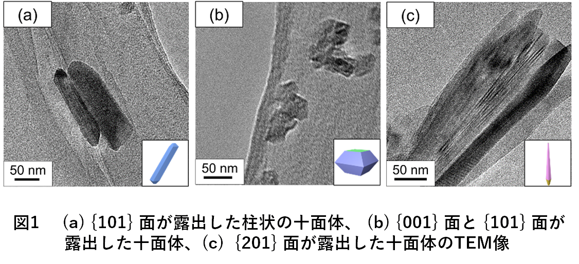 地球温暖化などの環境問題や化石資源の枯渇といったエネルギー問題を解決し、持続可能な社会を実現するために、再生可能エネルギーを利用した発電が注目されている。再生可能エネルギーは電力の供給が不安定であるため、実用化には電気エネルギーを貯めておき、必要に応じて取り出して利用することが必要である。そこで、電気エネルギーと化学エネルギーを直接変換できる電気化学反応が注目されている。 我々は、貯蔵性や輸送性に優れた物質としてグリコール酸に注目し、アナターゼ型のTiO2粒子を電極触媒に用いることで電気化学的還元反応によって二価のカルボン酸であるシュウ酸から一価のアルコールであるグリコール酸が高効率かつ高選択的に生成できることを報告している[1]。我々は、本反応での触媒活性を向上させるため、結晶面と形状が制御されたアナターゼ型のTiO2粒子を調製し、その構造とシュウ酸からグリコール酸への電気化学反応の触媒特性の関連について研究した。 まず、ソルボサーマル法によって、 {101} 面や {001} 面などの特定の結晶面が露出し、形状を制御したアナターゼ型のTiO2粒子を合成した。粉末X線回折 (XRD) 測定によって、得られた粒子の構造はアナターゼ型のTiO2粒子であることを確認し、透過型電子顕微鏡 (TEM) 観察、走査型電子顕微鏡 (SEM) 観察から、得られた粒子の形状が制御されていることを確認した(図1)。 形状制御されたTiO2粒子上での電気化学的シュウ酸還元反応における生成物分布を調べたところ、グリコール酸などの生成物選択性は、粒子形状に依存することがはじめてわかった。さらに、TiO2粒子の物性と反応選択性との詳細な検討の結果、TiO2粒子の触媒特性は、結晶面指数ではなく、粒子の頂点や伝導帯のエネルギー準位と相関していることが明らかとなった。